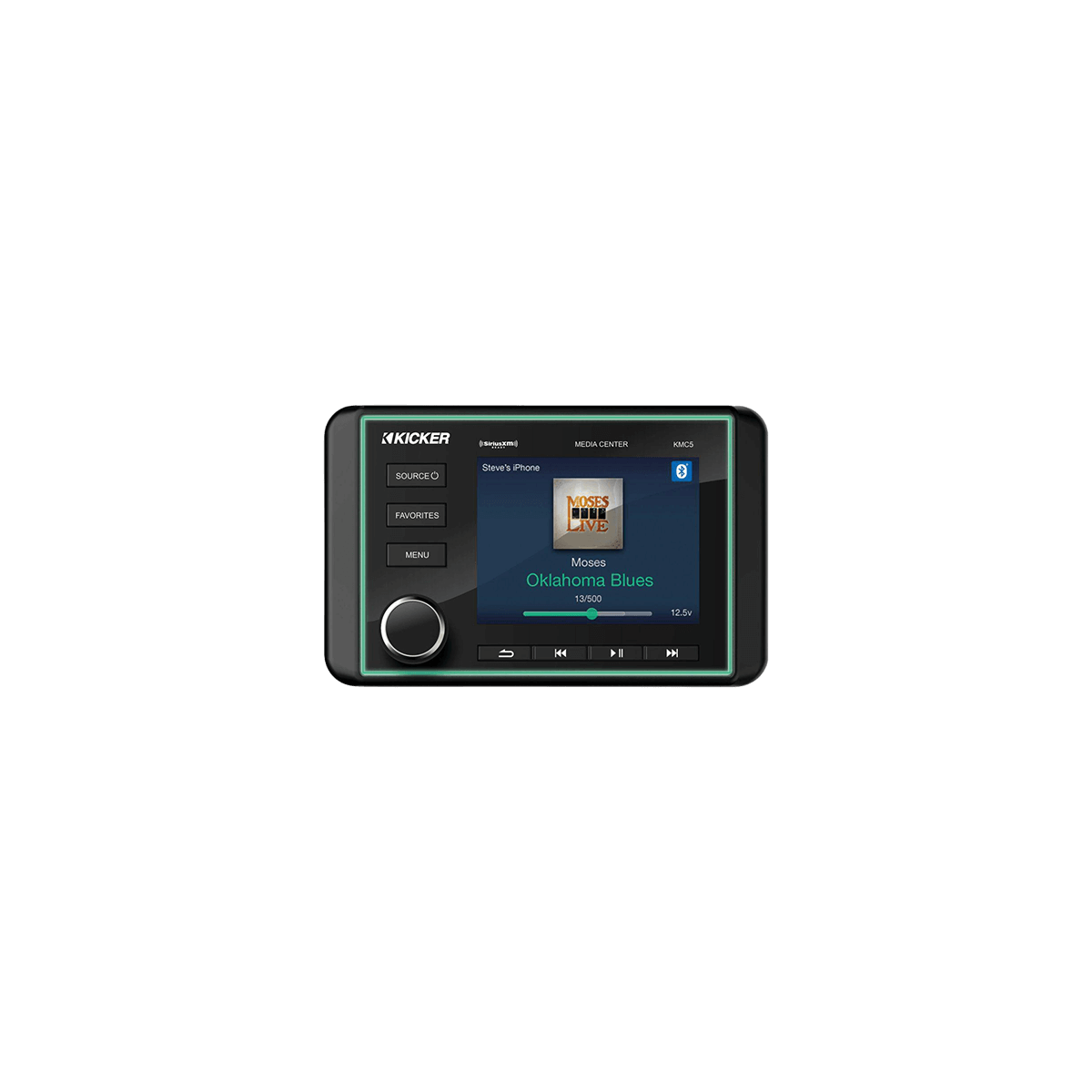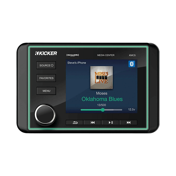 The Kicker KMC5 marine radio offers powerful, intuitive audio control on board, with its anti-glare 3.5" color LCD display and navigation wheel.