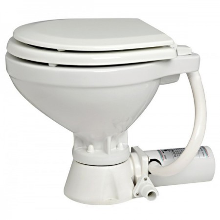 The Compact 12 V electric toilet fromOsculati, with white lacquered wooden seat, is designed to meet on-board space constraints. Its compact size means it can be installed in even the narrowest cabins, while maintaining remarkable evacuation efficiency. The self-priming-bronze pump with neoprene turbine ensures reliable operation at-above or-below the waterline.