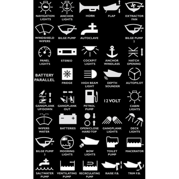 - (ON) OFF temporary: the function is active only as long as the button is pressed Ex. 1 : switch - WARNING Ex. 2 : switches - REMOVE/REMOVE ANCHOR ON OFF ALTERNATE: two keys can be programmed to activate one function so that another is switched off simultaneously, and vice versa.Ex.: SHIMMING PUMP MANUAL/AUTOMATIC xml- buttons are backlit yellow in standard mode, blue when the function is active and red when the connected circuit is short circuit.The panels are designed to be modular: when juxtaposed vertically and/or horizontally, they create the effect of a single integrated control panel with 4, 6, 8 (4+4), 10 (6+4), 12 (6+6) switches, and so on. The connection between the control unit and the panel is pre wired with a quick connector. The cable is 1.5m long, with the option of adding an extra 1.5m extension cable. Operation is protected against overload and reverse voltage (MOSFET module). The control unit is fitted with 4 or 6 thermal fuses, which intervene in the event of a short circuit (function button illuminated in red). The fuse resets automatically once the short circuit has been removed, and the button reverts to yellow. CE-certified panels, IP67 protection rating.-