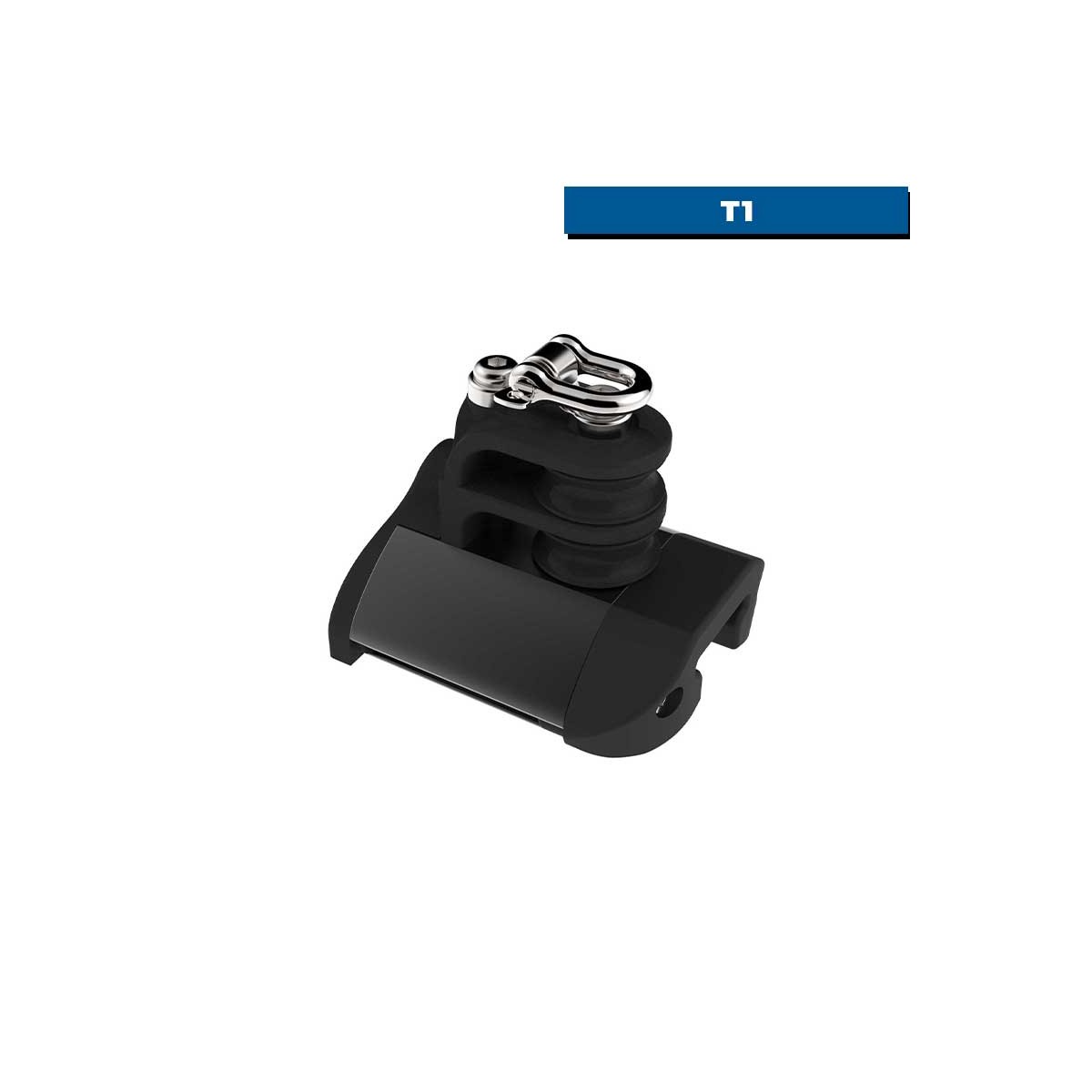 The T1 HTX double-sheave, ringed travel stop attaches to a rail and stops the traveler at the end of its stroke, while offering two end passes for the control lines.