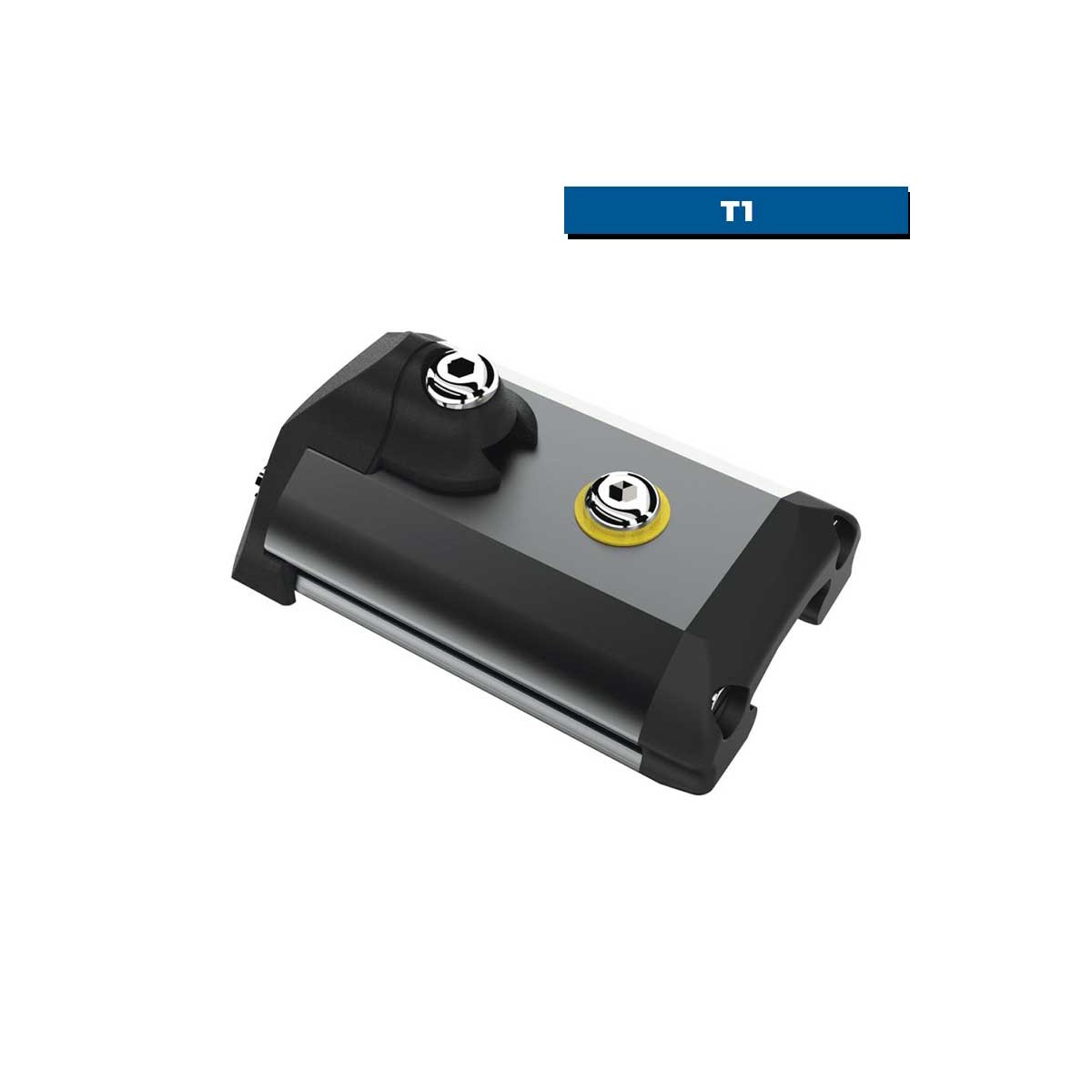 The bare T1 stop prevents the clew carriage from leaving the track and acts as an end-of-stroke limit. Here, the stop stands alone, without a sheave or pulley.