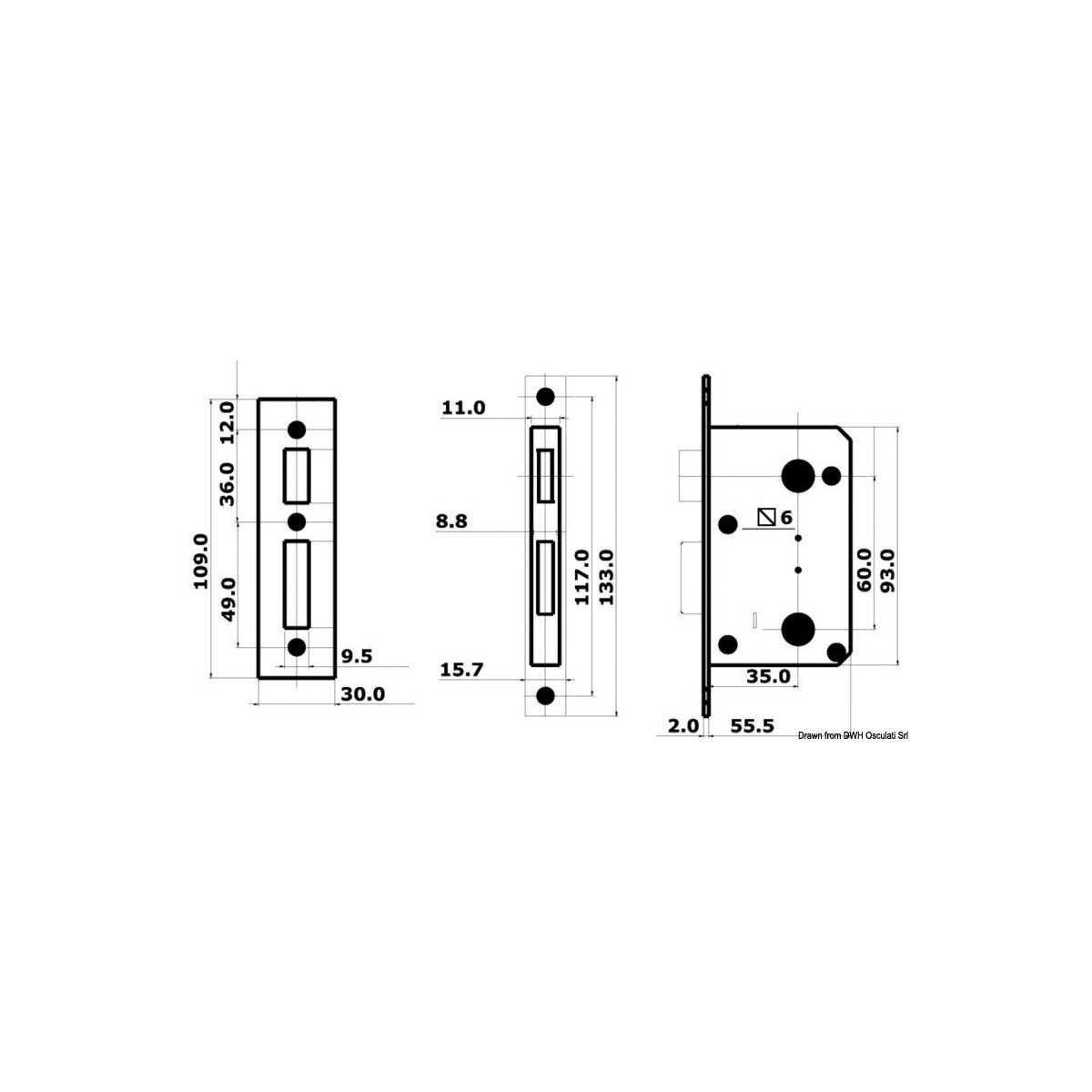 Dimensions: 94x57x11.5 mm. For 16/38 mm thick doors.