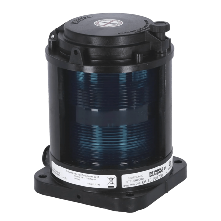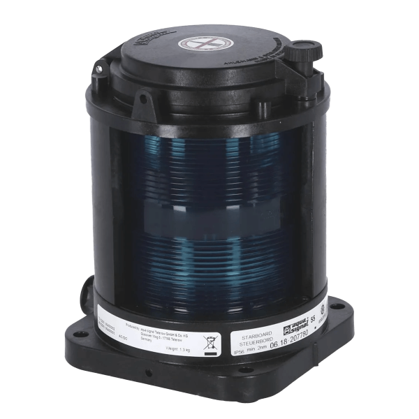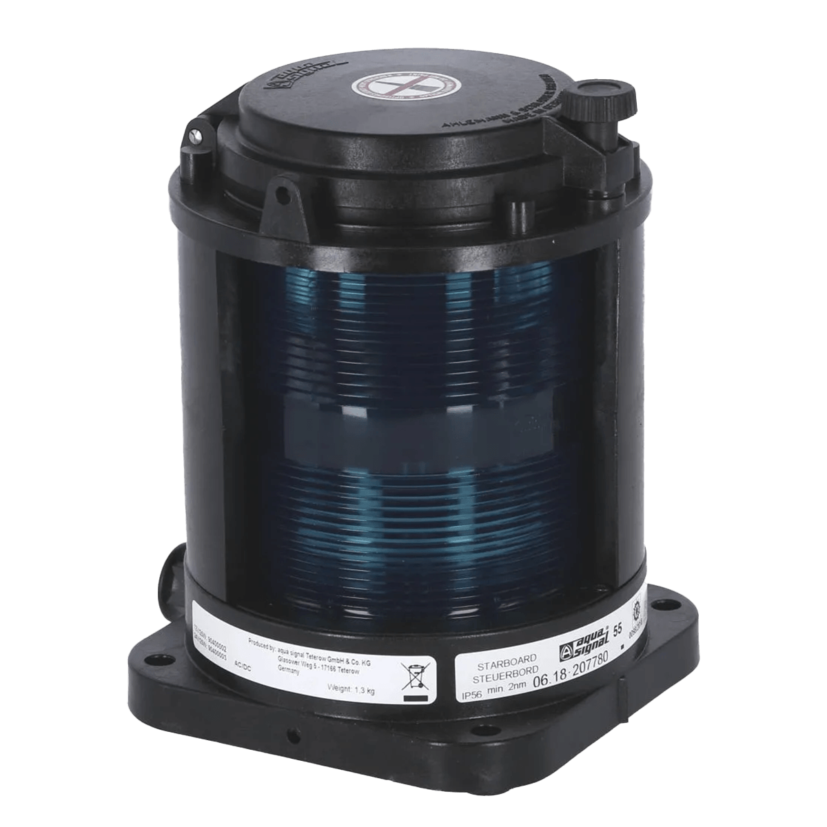 The starboard light Aqua Signal Series 55 is a green light designed for boats from 20 to 50m. It has a range of 2 nautical miles. VERITAS-approved series. Lights marked with an anchor are approved for European river navigation. Body in black polycarbonate reinforced with fiberglass and stainless materials. IP56 protection.