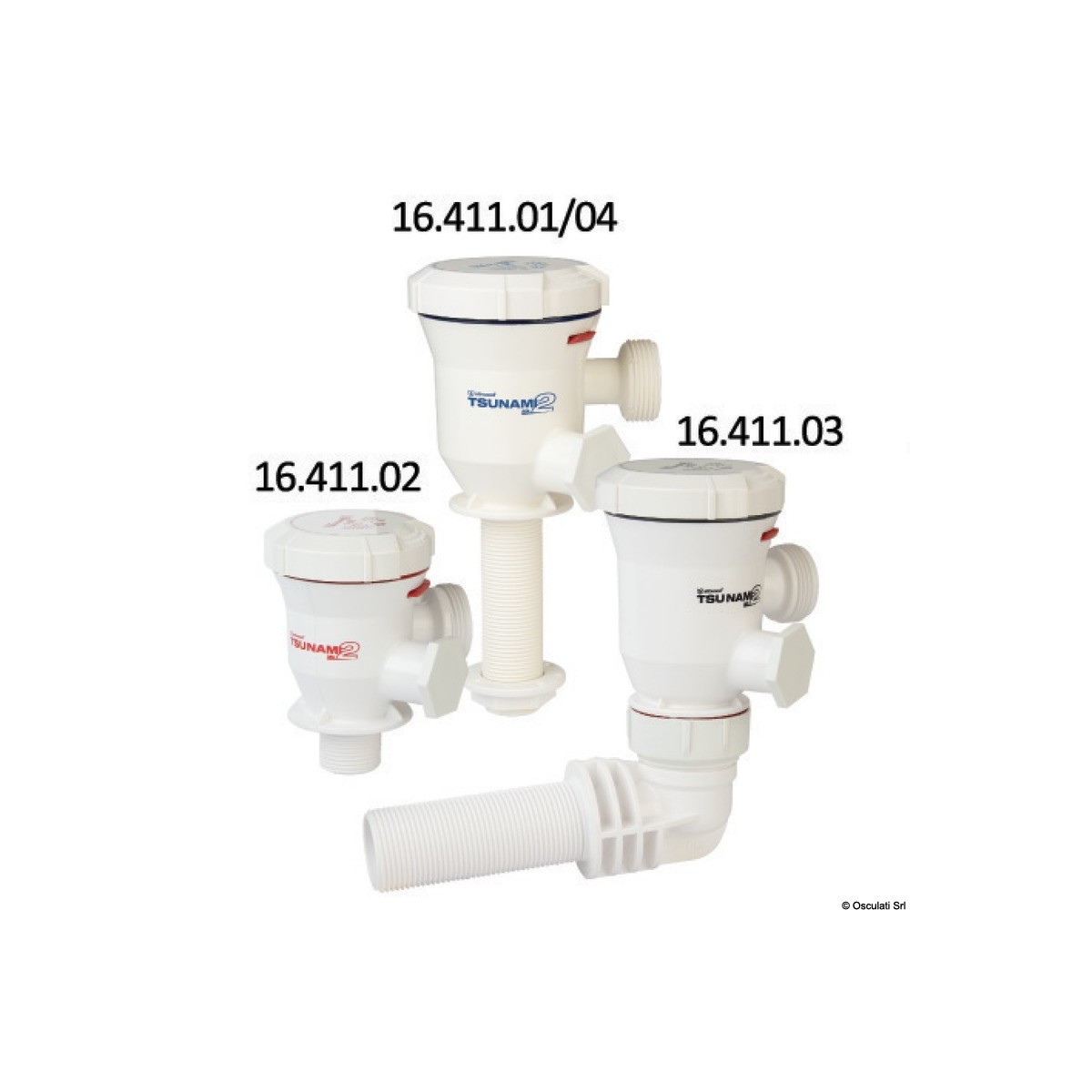 For use in catch and bait tanks; mounted directly on the transom or remotely with a hose.