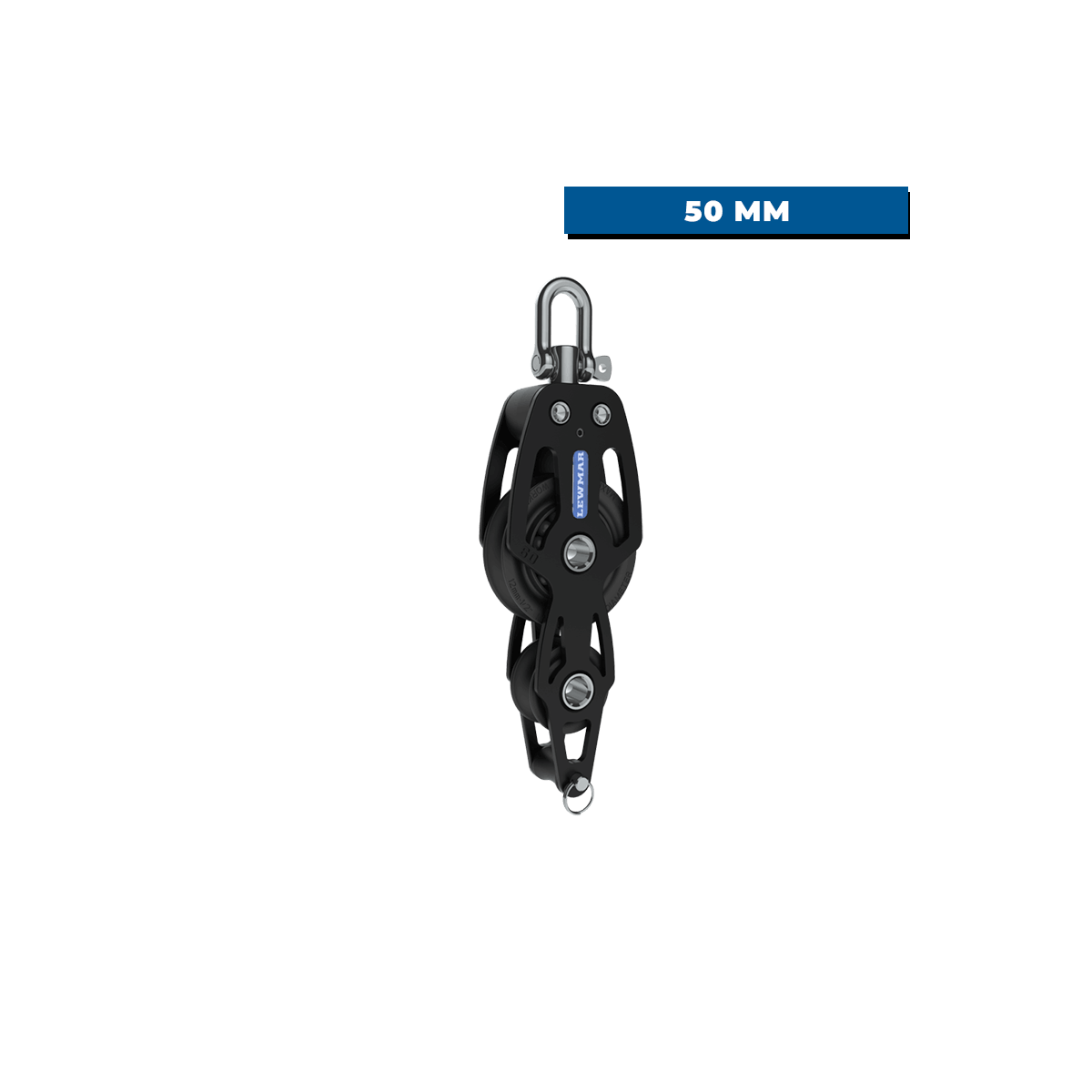With its 50 mm sheave and ringot, this fiddle block is designed for frequently adjusted systems and heavy loads. It works very well with modern small-diameter ropes. Its performance improves from 450 kg upwards, when the acetal sheave becomes self-lubricating-.