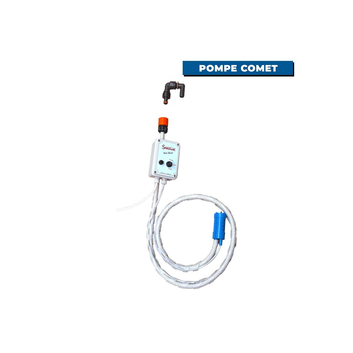 Sardamatic Wake Blood electric immersion pump for on-board priming and rinsing. Built-in timer (15 s on - 1 min off) or continuous operation. Ideal for livewells and bait tanks. Low power consumption (approx. 0.5 A/h in timed mode). Supplied with fittings for quick installation and Comet pump.
