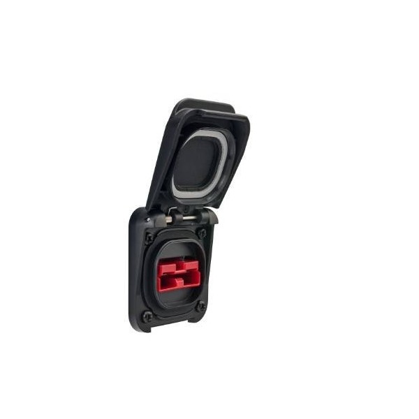This version features a red Anderson SB50 connector, designed for DC use on boats and vans. It accepts up to 50 A and 600 V DC, for a maximum power of 600 W at 12 V, 1200 W at 24 V and 2400 W at 48 V. IP68 sealing applies to the front panel, and IP69K with the cover closed.