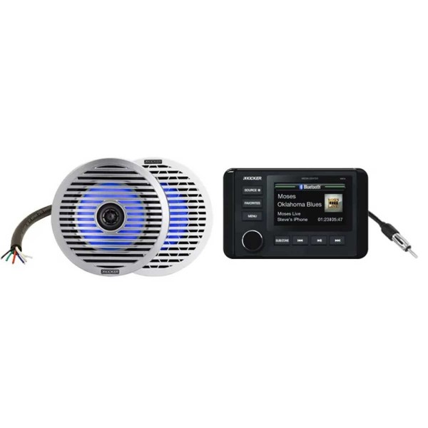 The KMC5 marine audio pack brings together KICKER's expertise in a complete package to provide your boat with a powerful, attractive and durable sound system. The KMC5 marine radio controls 2 independent audio zones, accepts a video input (reversing camera for example) and integrates with the NMEA 2000 network for a modern, connected installation. The slim-mounted 6.5" LED marine-speakers blend into the hull while delivering precise sound, while the KMLC LED remote control manages the lighting ambience on board, and the wired AM/FM antenna ensures stable radio reception underway.
