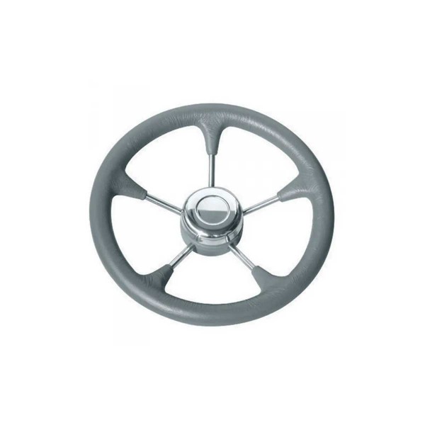 The T9R steering wheel in soft grey polyurethane with stainless steel spokes features a universal cone for compatibility with Ultraflex, Morse or Teleflex cables.