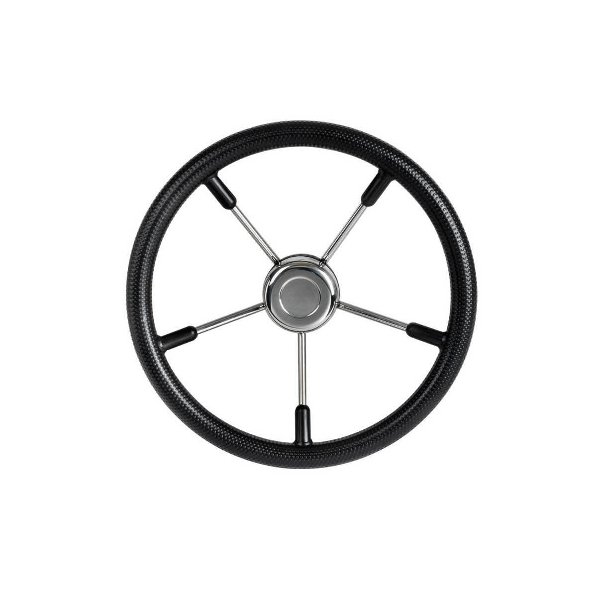 The T9 steering wheel with stainless steel and soft black polyurethane handles features a universal cone for compatibility with Ultraflex, Morse or Teleflex cables.