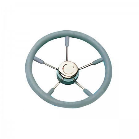 The T9 steering wheel with stainless steel and soft gray polyurethane handles features a universal cone for compatibility with Ultraflex, Morse or Teleflex cables.