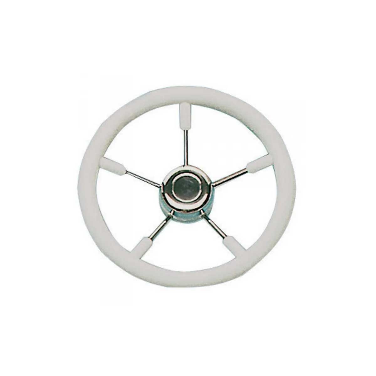 The T9 steering wheel with stainless steel and soft white polyurethane handles features a universal cone for compatibility with Ultraflex, Morse or Teleflex cables.