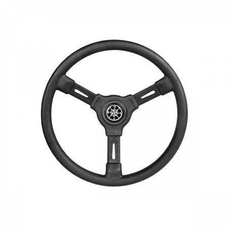 The black anatomical 3-spoke steering wheel features a central hub with universal cone and a 35.5 cm outer diameter for versatile on-board installation.