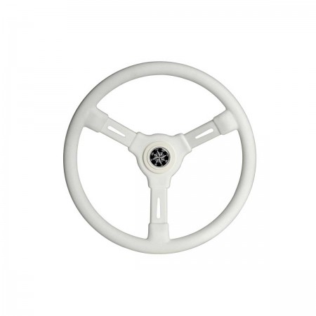 The anatomical white 3-spoke steering wheel features a central hub with universal cone and a 35.5 cm outer diameter for versatile on-board installation.