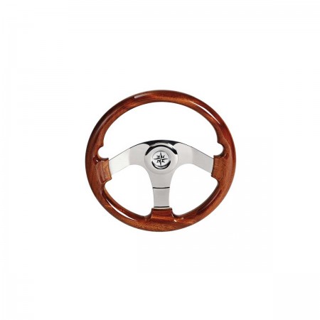The T12 steering wheel in varnished mahogany, 35 cm in diameter, has 3 spokes and a mirror-polished stainless steel hub.