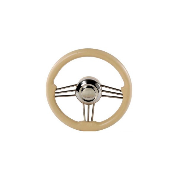 The T14 mirror-polished stainless steel steering wheel features a 35 cm diameter cream polyurethane rim and a central hub with universal cone for mounting on many boats.
