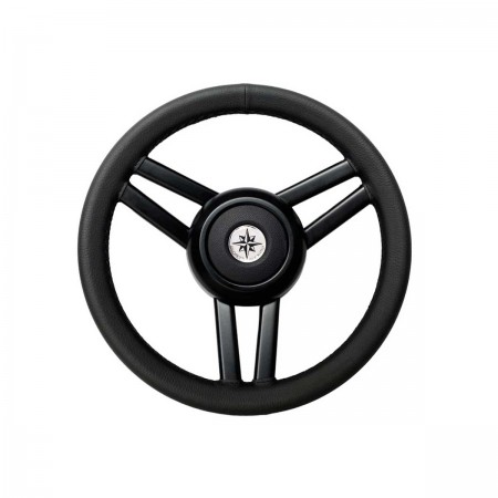 The black T25 Ghost steering wheel is covered in hand-stitched leather with black-painted stainless steel spokes and universal hub.